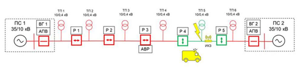 Для большинства современных распределительных сетей этот этап даст максимально возможный уровень надежности. Это будет достигаться за счет введения второго центра питания и организации пункта сетевого АВР (Автоматического ввода резерва). На схеме выше реклоузер Р 3 устанавливается в точка нормального разрыва линии и в нормальном режиме работы находится в отключенном состоянии. При пропадании напряжения на одной из сторон срабатывает АВР и питание автоматически подается на отключенный участок. Является эффективным способом восстановления питания потребителей всего фидера при отключении одного из центров питания. На примере выше при КЗ в той же точке изолируется только поврежденный участок с ТП 5. Все остальные 5 потребителей остаются в работе.