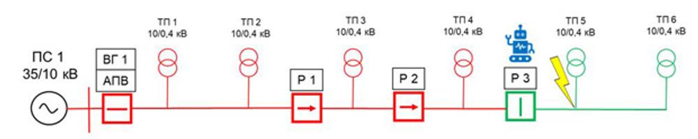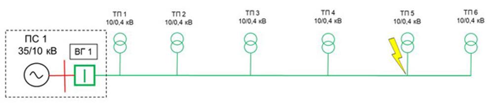 На начальном этапе устройства защиты установлены только на головном выключателе питающей подстанции. Используются электромеханические реле защиты, линейных коммутационных аппаратов на фидере нет, АПВ (автоматическое повторное включение) отсутствует. Любое КЗ, как устойчивое, так и неустойчивое приводит к отключению всего фидера. Например, при возникновении КЗ у ТП5 10/0,4 кВ сработает выключатель ВГ 1 и отключит все 6 потребителей линии.