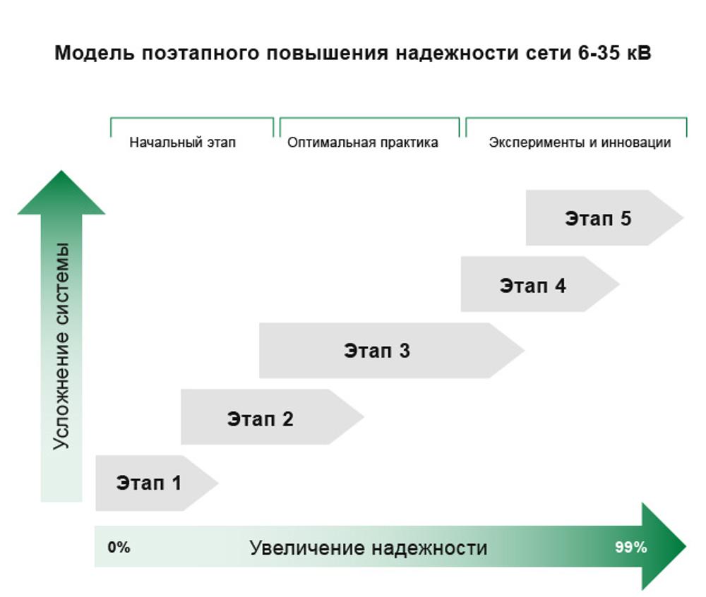Идея «ступенек» заключается в том, что при внедрении новых практик крайне маловероятно, что сетевая организация сможет быстро перепрыгнуть сразу через несколько ступенек. Работая на каждом этапе повышения надежности сети, мы опираемся на опыт, накопленный на предыдущем уровне. Например, будет очень сложно сразу перейти от этапа 1 с защитой на базе подстанционных выключателей и электромеханических реле к полностью автоматизированной интеллектуальной сети Smart Grid 4-го этапа, не пройдя промежуточных этапов. Более того, если оценить соотношение эффекта от внедрения к уровню инвестиций, для многих операторов целесообразным будет остановиться на 3-м или 4-м этапе, не переходя на 5-й. Тем не менее, модель задает вектор развития, необходимый для планирования прогрессивного повышения надежности сети.